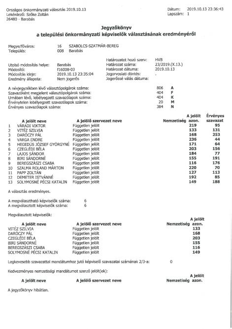 Barabás Község Helyi Választási Bizottsága a helyi önkormányzati képviselők és polgármesterek 2019. október 13. napjára kitűzött általános választásán a Szabolcs- Szatmár- Bereg megyei Barabás településen a települési önkormányzati képviselők választásáról készült szavazóköri jegyzőkönyvek alapján a települési önkormányzati képviselők választása eredményének megállapítása tárgyában meghozta a következő